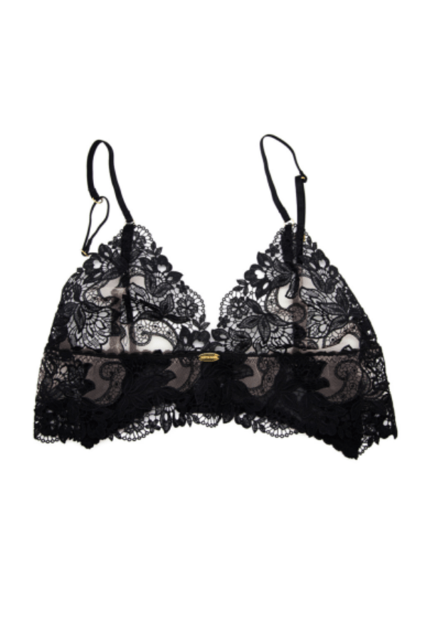 If you love a mix of sweet and bold, the Brazil Triangle Bralette in Blackis your perfect match. Delicate floral embroidery meets a sultry black hue, while a front clip closure and dainty tie detail add just the right amount of playful charm. Adjustable straps ensure a personalized, comfortable fit.
