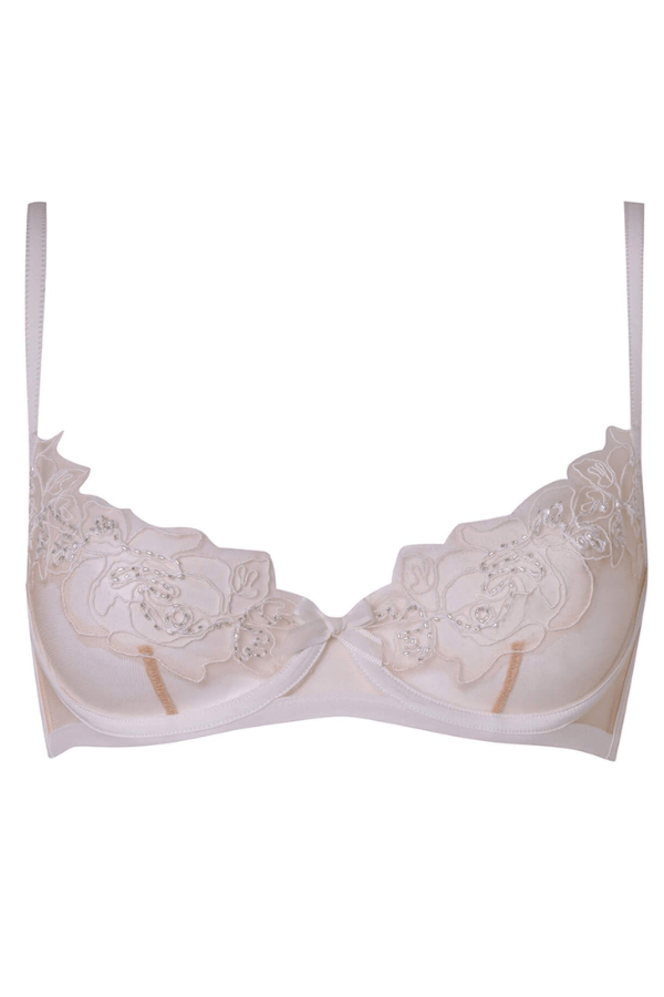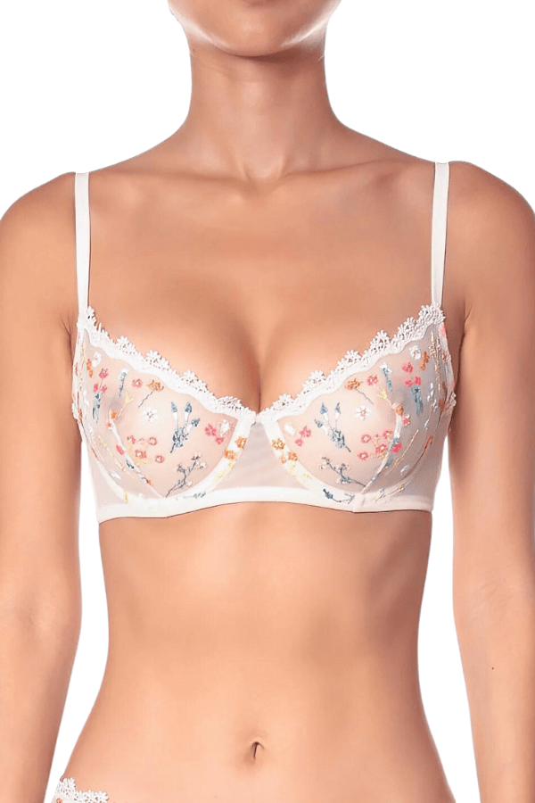 Slowly taking on the Lingerie fashion scene is the French luxury brand Huit. Their pieces have a sweet youthfulness, but we’re especially in love with the Boogie Wonderland bra with its pink-white mesh and a tiny menagerie of embroidered florals. A floral guipure trim adds the finishing touch.