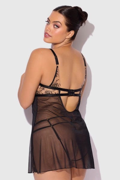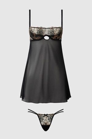 Delilah Embroidered & Mesh Monowire Babydoll Set Black