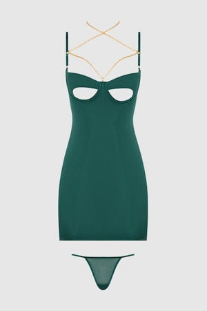 88% Nylon, 12% Spandex. Exclusive of trims and elastic. Evangeline satin and chain cutout cup with open-back chemise, perfect for sultry, playful nights.