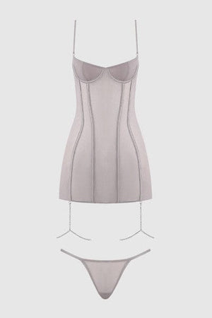 88% Nylon, 12% Spandex. Exclusive of trims and elastic. Presley shine mesh and rhinestone chemise with G-string, perfect for playful, sultry evenings.