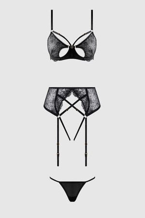 Embroidery: 100% Polyester. Satin: 97% Polyester, 3% Spandex. Exclusive of trims and elastic. Open-cup bra, garter, and G-string set for bold self-expression and intimate moments.