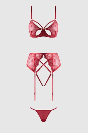 Embroidery: 100% Polyester. Satin: 97% Polyester, 3% Spandex. Exclusive of trims and elastic. Rosalie open-cup bra, garter, and G-string set designed for bold and sultry allure.