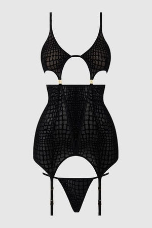 88% Nylon, 12% Spandex. Exclusive of trims and elastic. Snake velvet-burnout mesh chemise with G-string, perfect for daring, sultry nights.