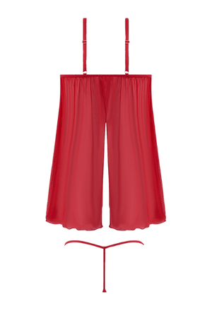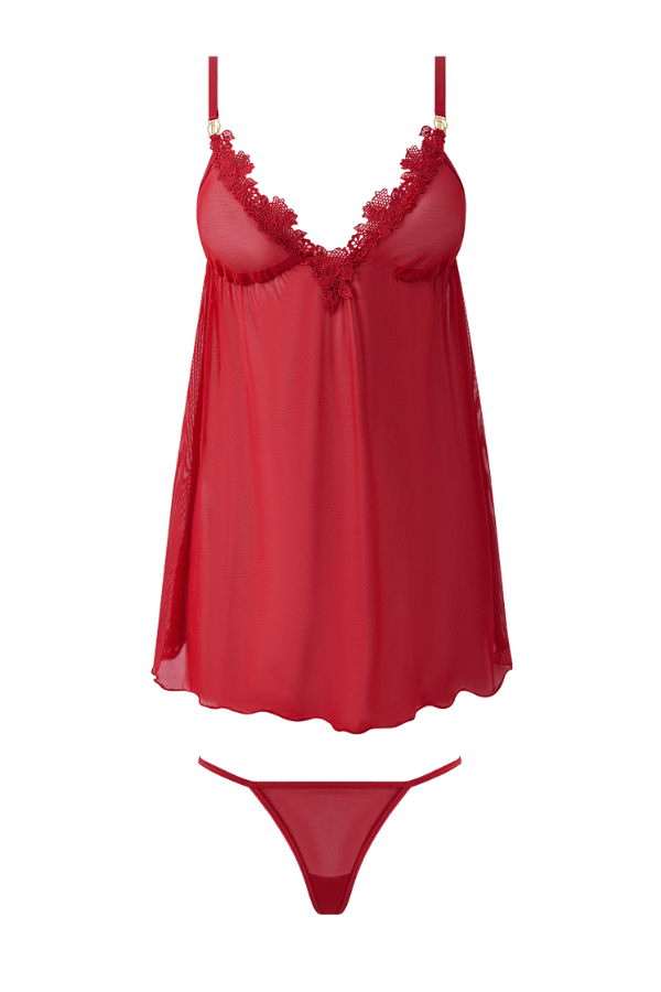 Shell: 100% Polyester. Fabric: 88% Nylon, 12% Spandex. Exclusive of trims and elastic. Lace and mesh babydoll with G-string for playful intimacy and confidence.