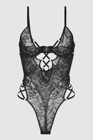 88% Nylon, 12% Spandex. Exclusive of trims and elastic. Strappy lace teddy designed to enhance sensuality and create a seductive silhouette.
