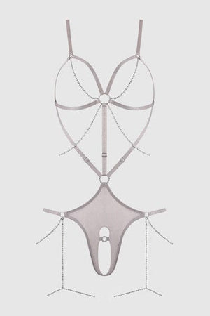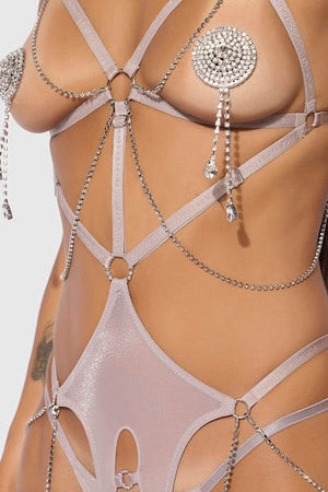 88% Nylon, 12% Spandex. Exclusive of trims and elastic. Presley shine mesh open cup and crotchless rhinestone teddy for bold, seductive confidence.