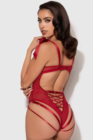Embroidery: 100% Polyester. Satin: 97% Polyester, 3% Spandex. Exclusive of trims and elastic. Rosalie embroidered lace teddy designed for sultry nights and romantic allure.