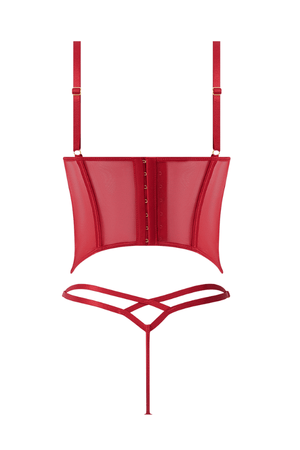 Shell: 100% Polyester. Fabric: 88% Nylon, 12% Spandex. Exclusive of trims and elastic. Ashley Alexiss lace bustier and G-string for confident, intimate evenings.