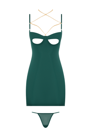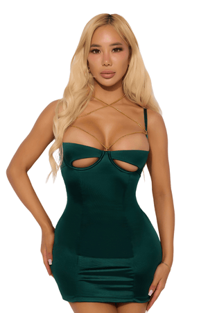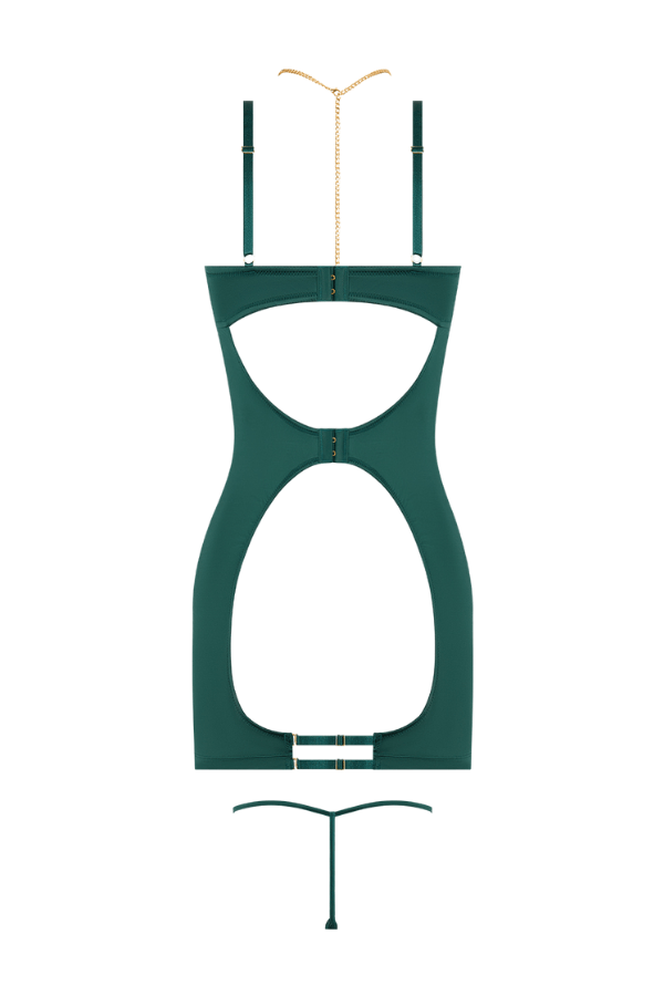 88% Nylon, 12% Spandex. Exclusive of trims and elastic. Evangeline satin and chain cutout cup with open-back chemise, perfect for sultry, playful nights.