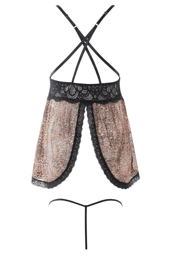 88% Nylon, 12% Spandex. Exclusive of trims and elastic. Leopard mesh and lace babydoll set from House of Desire, blending bold prints with delicate detailing. Perfect for playful, romantic nights.