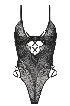 88% Nylon, 12% Spandex. Exclusive of trims and elastic. Strappy lace teddy designed to enhance sensuality and create a seductive silhouette.
