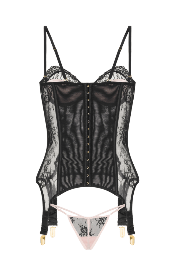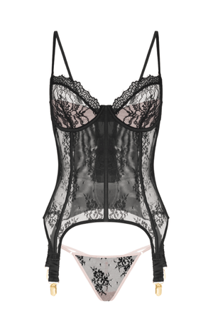 100% Nylon. Jocelyn lace and satin underwire corset with G-string, crafted to enhance curves and ignite confidence for romantic evenings.