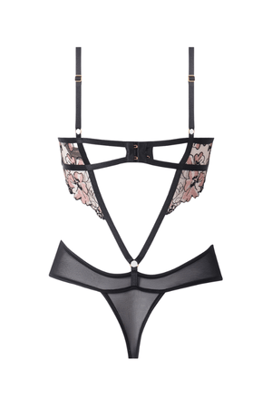 Shell: 100% Polyester. Mesh: 88% Nylon, 12% Spandex. Exclusive of trims and elastic. Nova Blacklight lace teddy, ideal for sultry evenings and intimate allure.