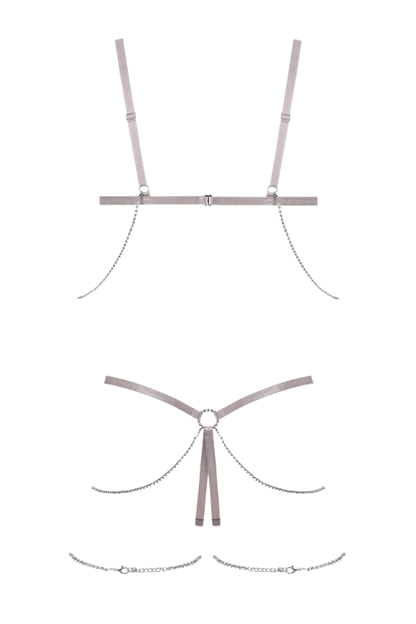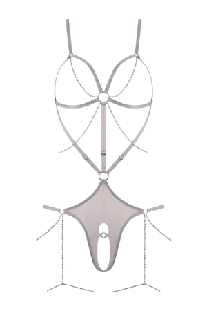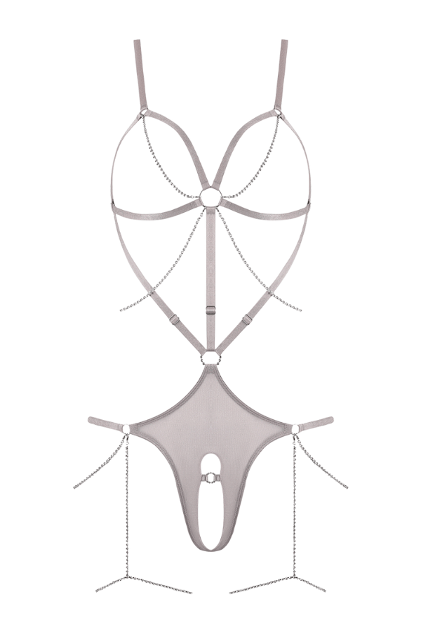 88% Nylon, 12% Spandex. Exclusive of trims and elastic. Presley shine mesh open cup and crotchless rhinestone teddy for bold, seductive confidence.