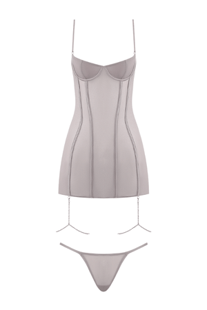 88% Nylon, 12% Spandex. Exclusive of trims and elastic. Presley shine mesh and rhinestone chemise with G-string, perfect for playful, sultry evenings.