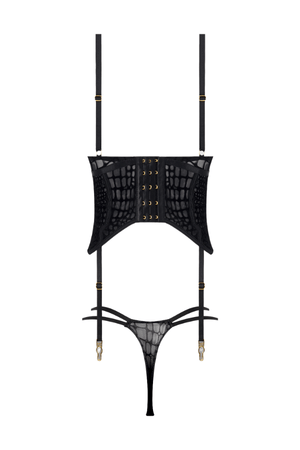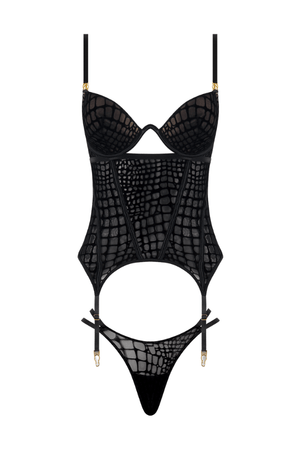 88% Nylon, 12% Spandex. Exclusive of trims and elastic. Snake velvet-burnout mesh bustier with thong, designed to create seductive confidence and romance.
