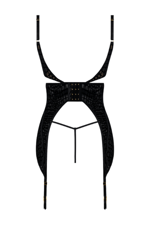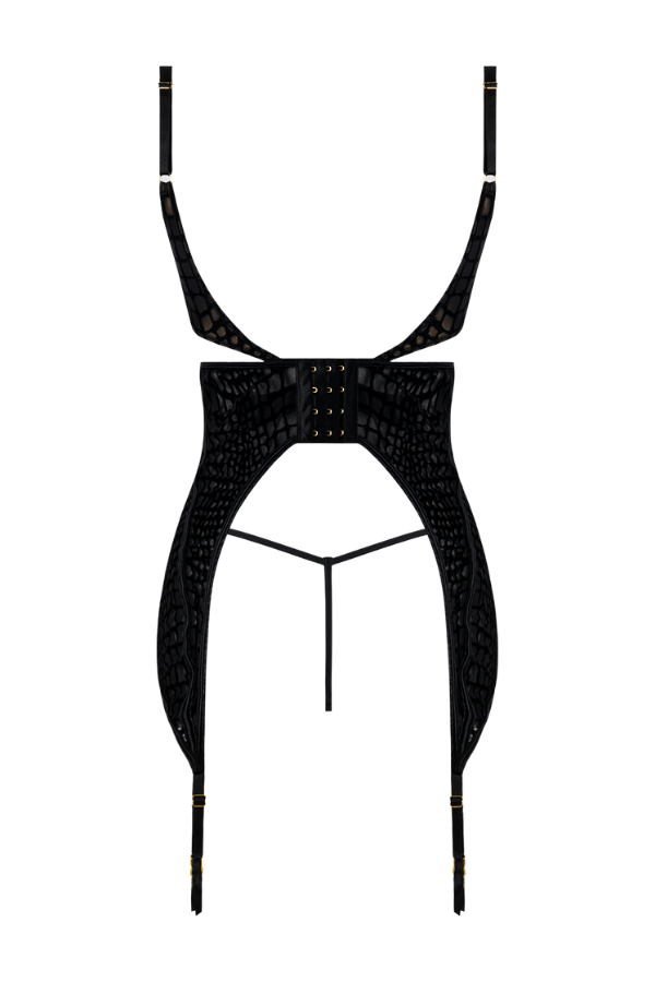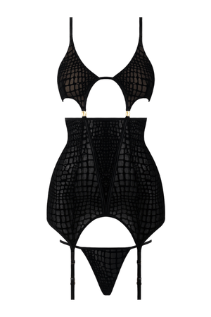 88% Nylon, 12% Spandex. Exclusive of trims and elastic. Snake velvet-burnout mesh chemise with G-string, perfect for daring, sultry nights.