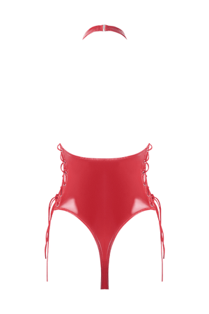 88% Nylon, 12% Spandex. Exclusive of trims and elastic. Trinity patent lace-up halter teddy, perfect for intimate, daring nights.