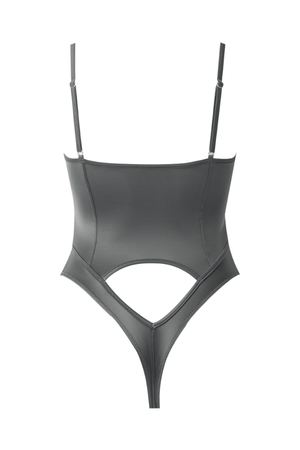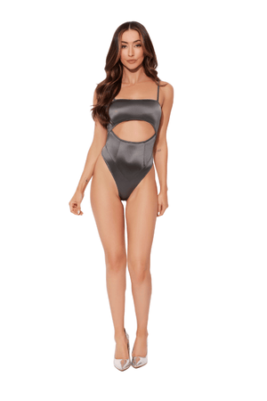 76% Nylon, 24% Spandex. Exclusive of trims and elastic. Cutout scoop back bodysuit in high-shine fabric, ideal for bold self-expression and romantic evenings.