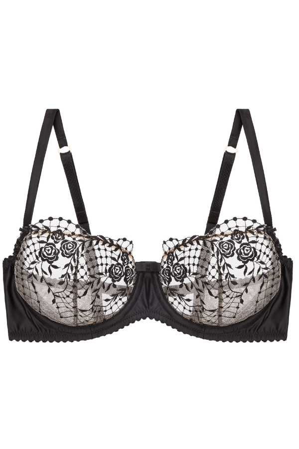 Julies Roses is created by Dita to honour her friend Julie Newmar, the original Cat Woman. Julie has a wonderful rose garden and her roses are an inspiration to this collection. The Julies Roses Underwire bra has sheer rose embroidered cups, wide satin straps and opulent detailing.