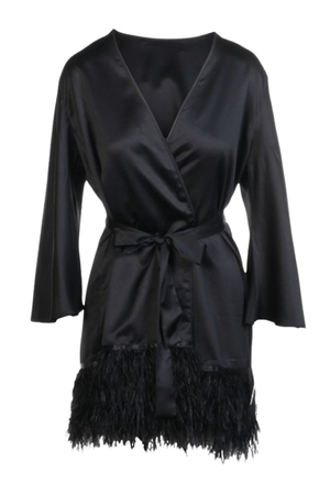 Bring your fantasies to life with the incredible presence of the Swan Cover Up. This lustrous poly-charmeuse cover up creates a flirtatious ambiance thanks to the beautiful ostrich feathers around the bottom hem.