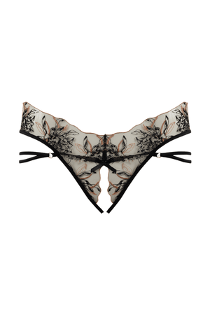 100% Polyester. Exclusive of trims and elastic. Strappy crotchless and backless hipster in embroidered detailing, designed for bold and unforgettable moments.