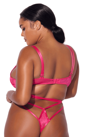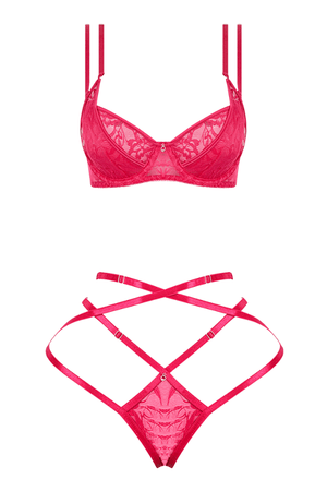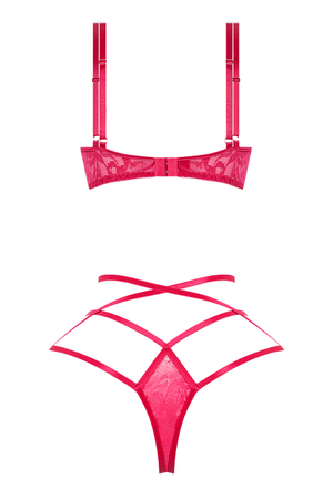 88% Nylon, 12% Spandex. Exclusive of trims and elastic. Lace bra with strappy thong that combines elegance with playful sensuality.