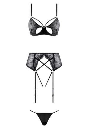 Embroidery: 100% Polyester. Satin: 97% Polyester, 3% Spandex. Exclusive of trims and elastic. Open-cup bra, garter, and G-string set for bold self-expression and intimate moments.