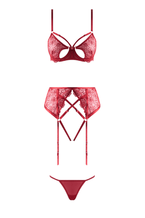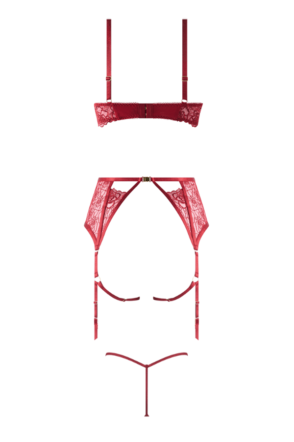 Embroidery: 100% Polyester. Satin: 97% Polyester, 3% Spandex. Exclusive of trims and elastic. Rosalie open-cup bra, garter, and G-string set designed for bold and sultry allure.