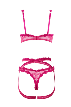 Shell: 88% Nylon, 12% Spandex. Lace: 90% Nylon, 10% Spandex. Exclusive of trims and elastic. Delicate lace bra, garter, and tanga set ideal for exploring intimate moments.
