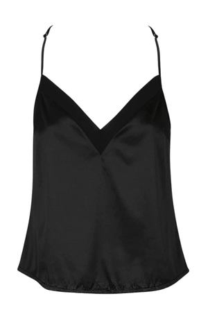 A sexy all satin shape to wear on top or underneath. V-shaped décolleté underlined by matt stripes. Thin adjustable straps. Back sublimated by the graphic play of matt stripes and lace.